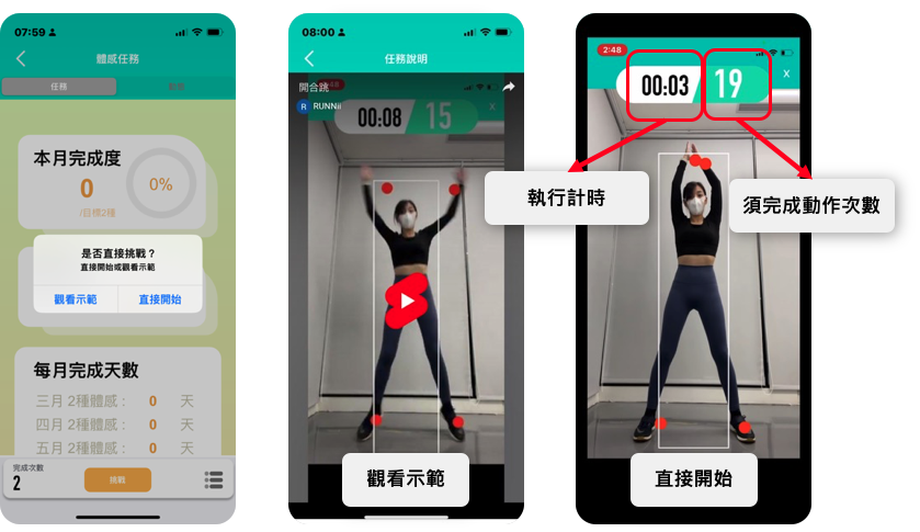 - 畫面上方標示「執行計時」、「需完成動作次數」