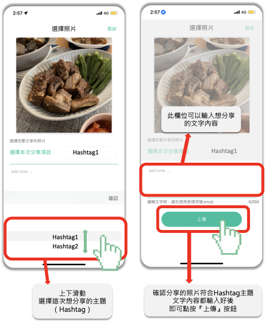 - 點按上方灰色框框即可選擇你拍下的餐食照片
