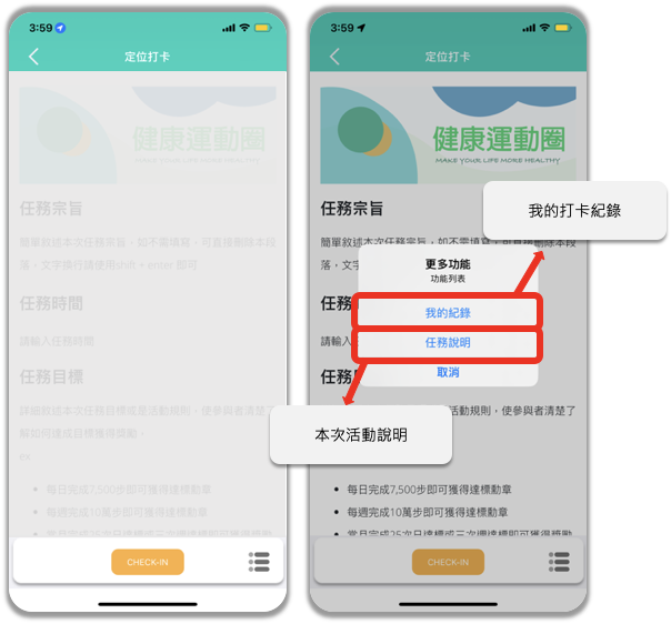 - 打開任務卡後,點按下方『CHECK-IN』打卡按鈕