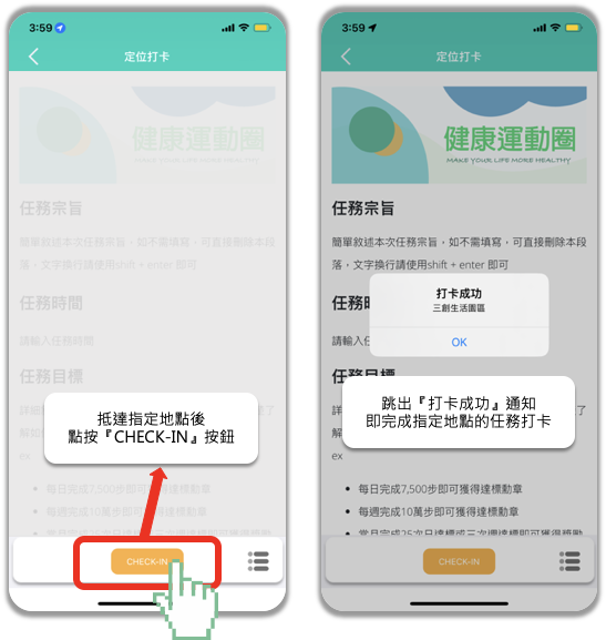 - 跳出『打卡成功』通知,即完成指定地點的任務打卡