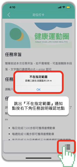 小提醒:若跳出不在指定範圍,可以點入右下角的「功能說明」按鈕,確認地點位置後前往;