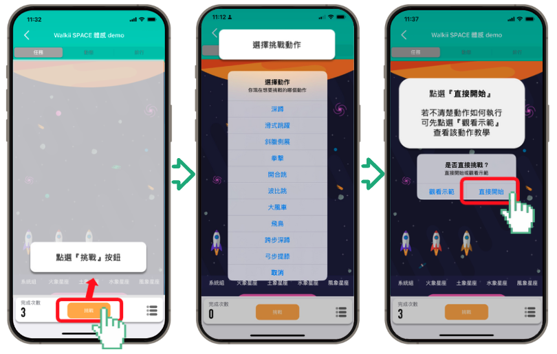 - 點擊『挑戰』按鈕,即可選擇動作