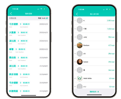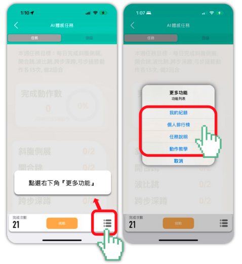- 點擊『功能列表』可以查看紀錄、排行榜、任務說明與動作教學