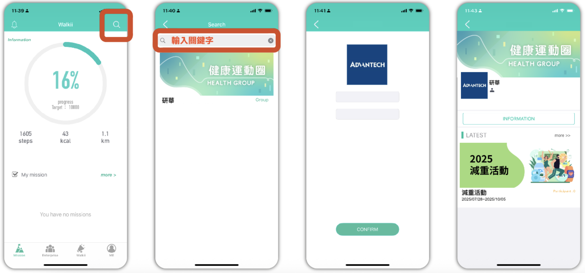 點選搜尋(右上角放大鏡),輸入『 研華 』,點選加入『 研華 』運動圈