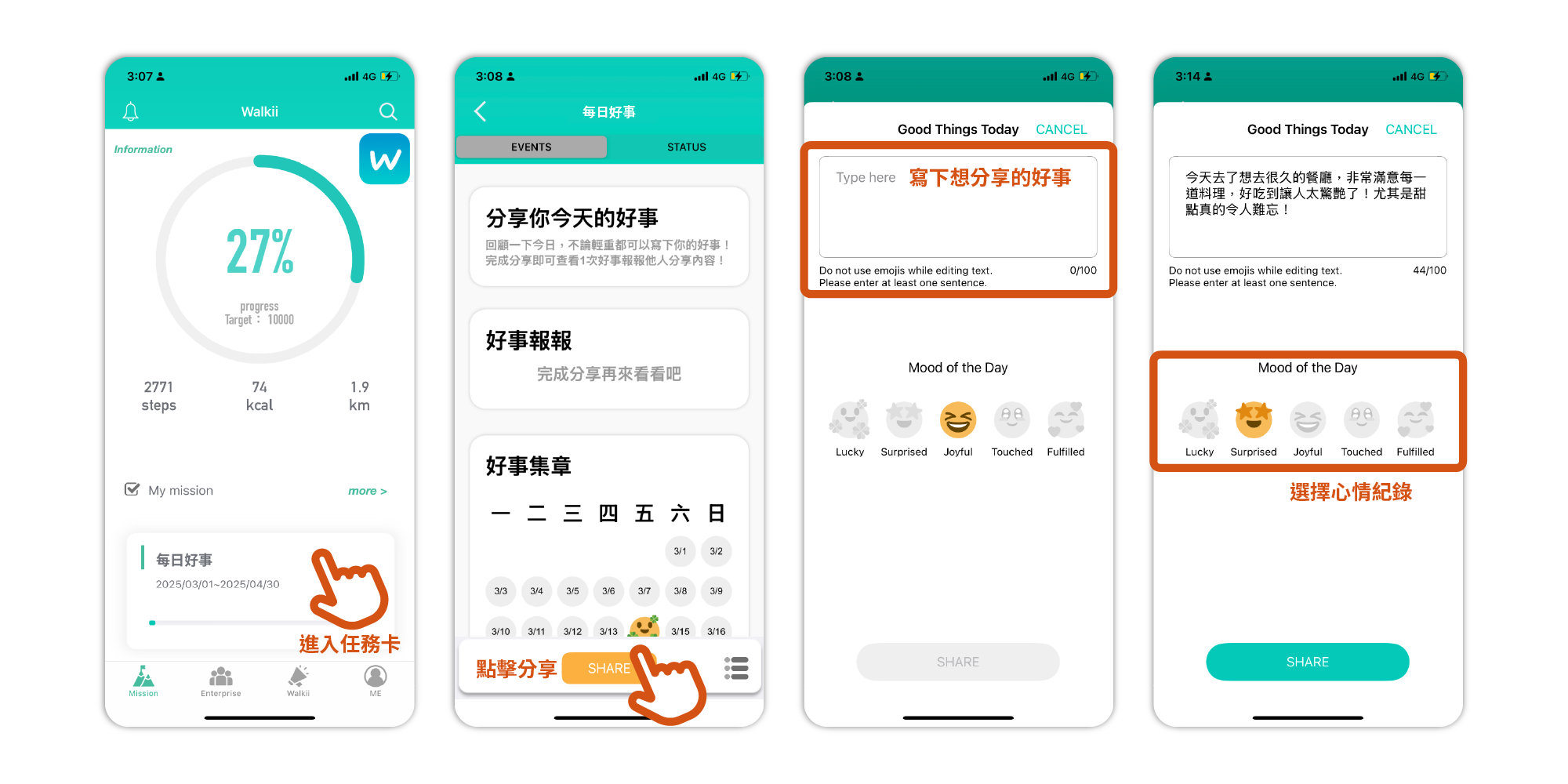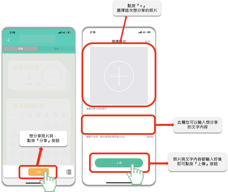 拍攝運動時的照片並寫下運動後的心情,紀錄至「運動分享區」,每1篇運動分享文可獲點數1點,每日上限2篇。