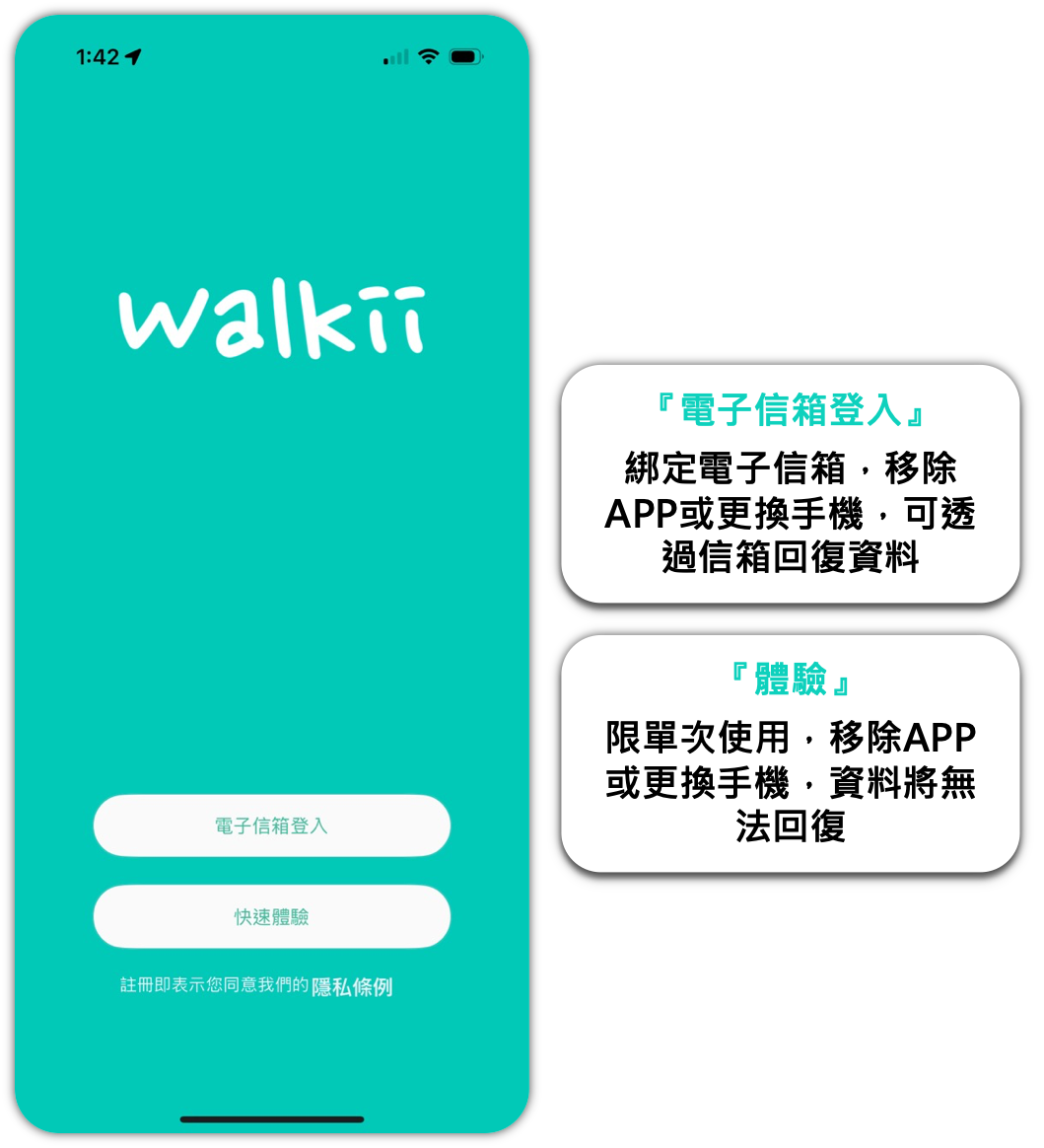 快速體驗 (Quick Experience):限制單次登入使用,如移除APP或更換手機將 “ 無法回復資料 ”