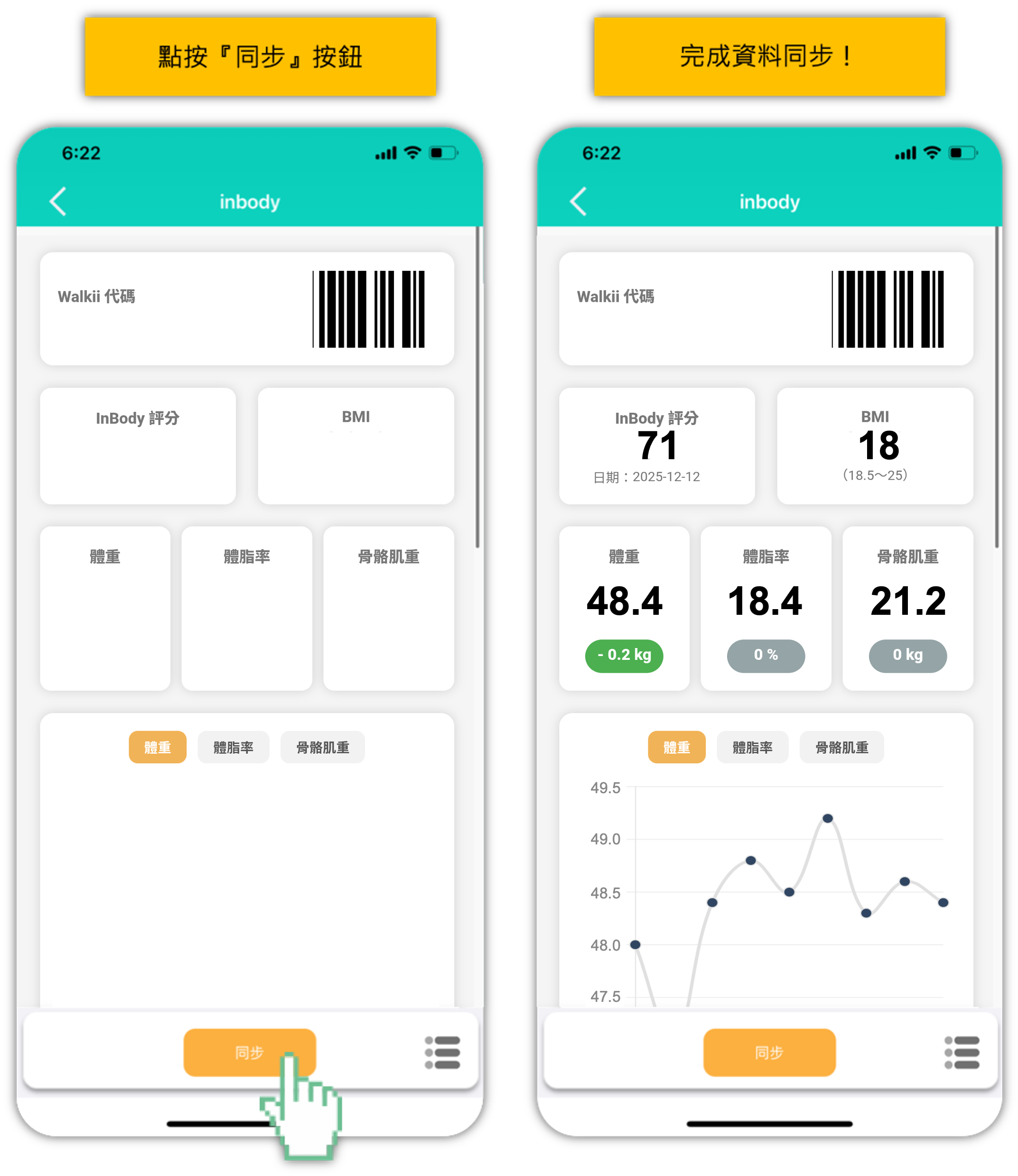 - 回到Walkii APP,點按『同步』按鈕 / Return to the Walkii App and click "Sync."