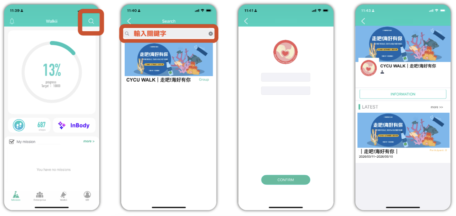 - 點選搜尋(右上角放大鏡),輸入『CYCU』,點選加入『CYCU WALK|走吧!海好有你』運動圈