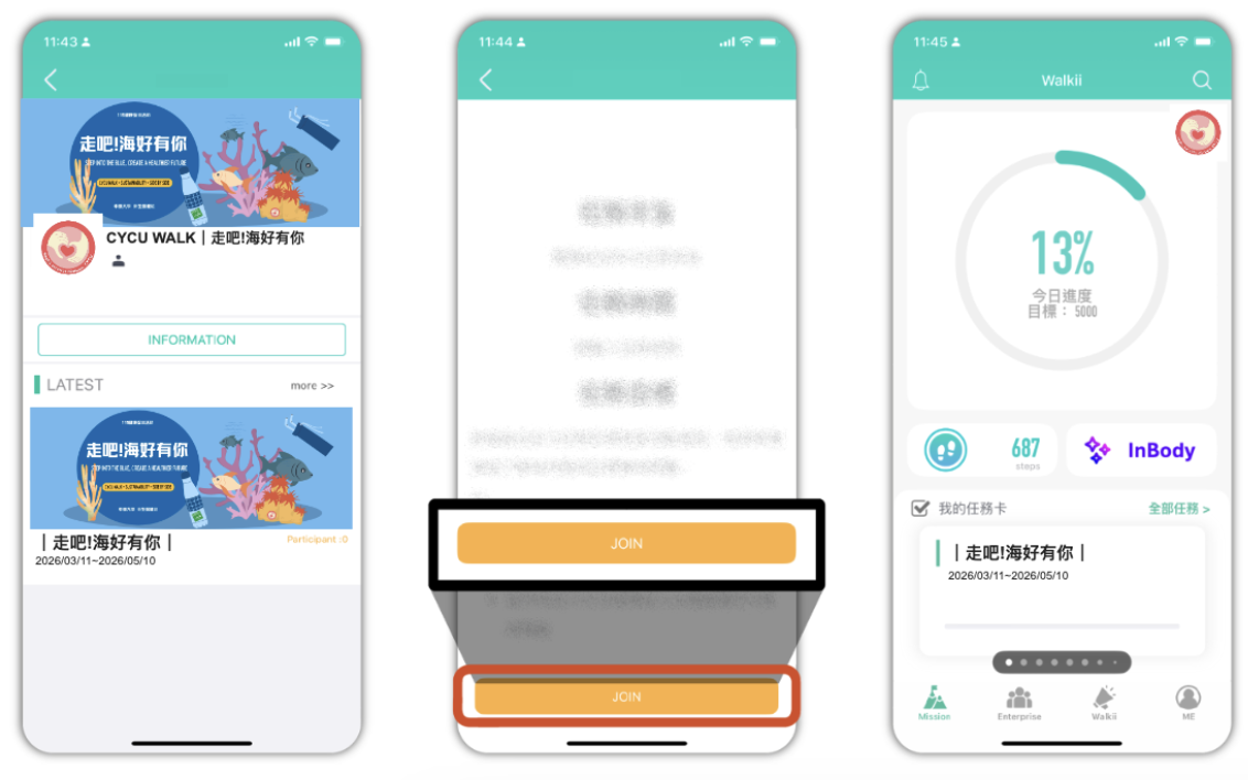 登入App並加入中原健走圈領取任務卡,完成任務後,依任務目標獲得指定點數: