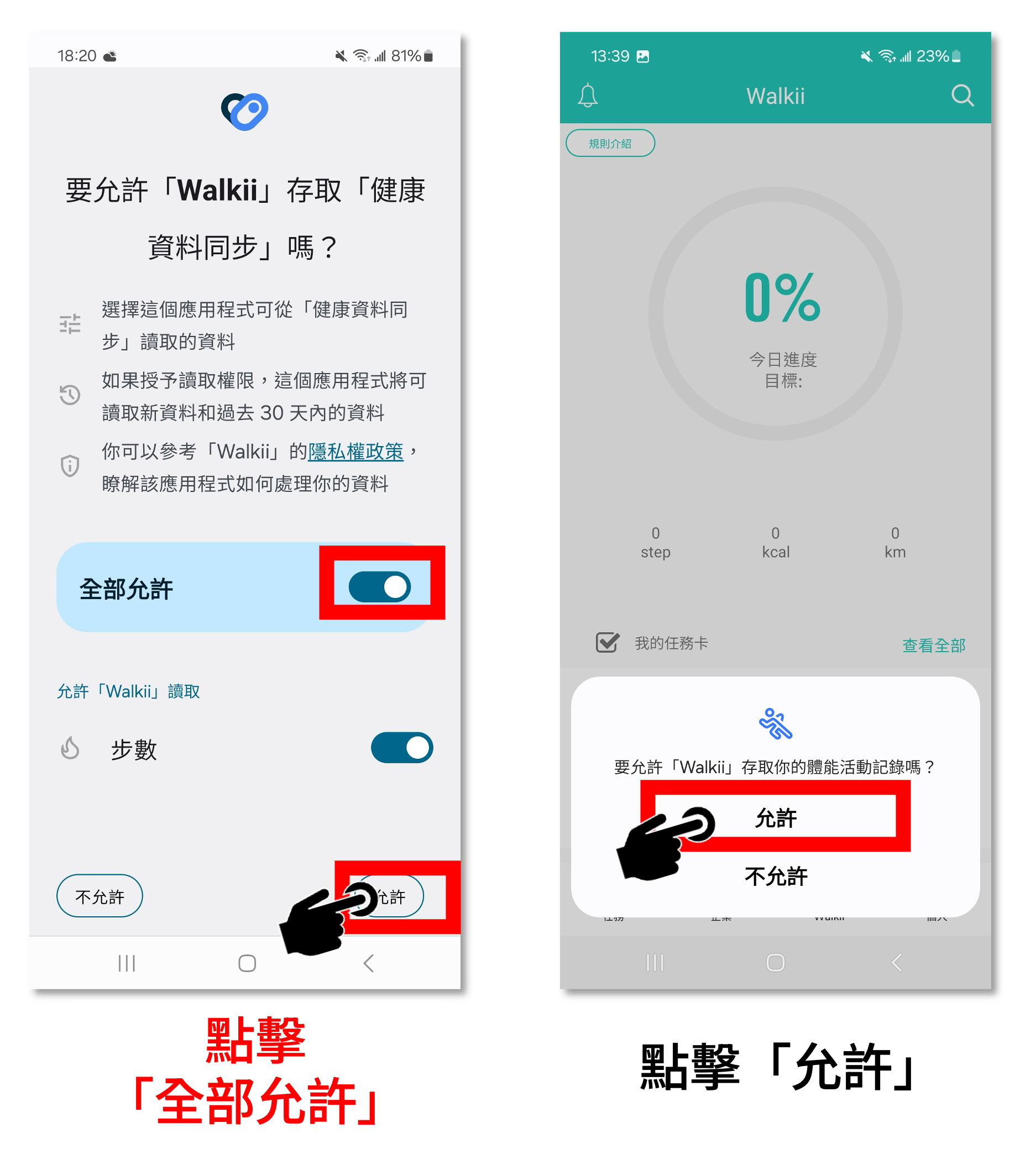 初次登入時,需先允許Health Connect資料,再開啟Walkii體能紀錄授權