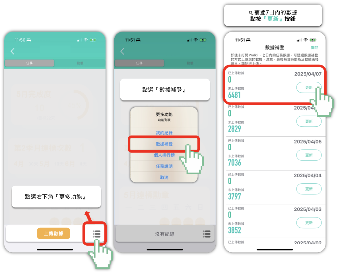 - 點入任務卡畫面右下角圖示,點選『數據補登』上傳七日內的步數數據