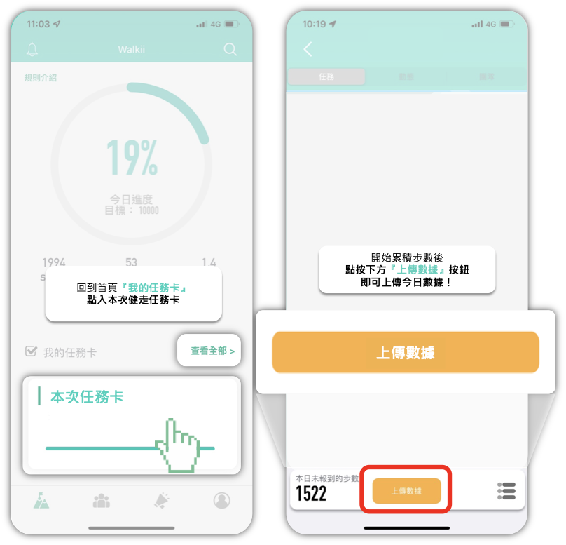 - 每日開啟APP點選任務卡內的『上傳數據』按鈕上傳當日數據。 如當日忘記上傳數據,可使用APP內的『數據補登』功能,七日內的紀錄皆可上傳。