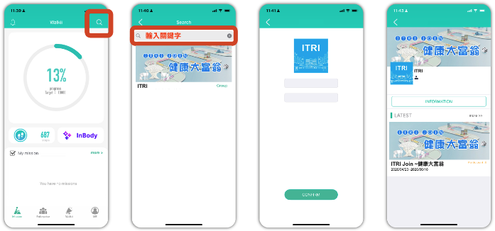 點選搜尋(右上角放大鏡),輸入『 ITRI 』,點選加入『 ITRI 』運動圈