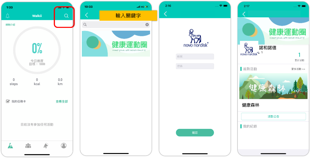 點選搜尋(右上角放大鏡),輸入『諾和諾德』,點選加入『諾和諾德 Novo Nordisk』運動圈