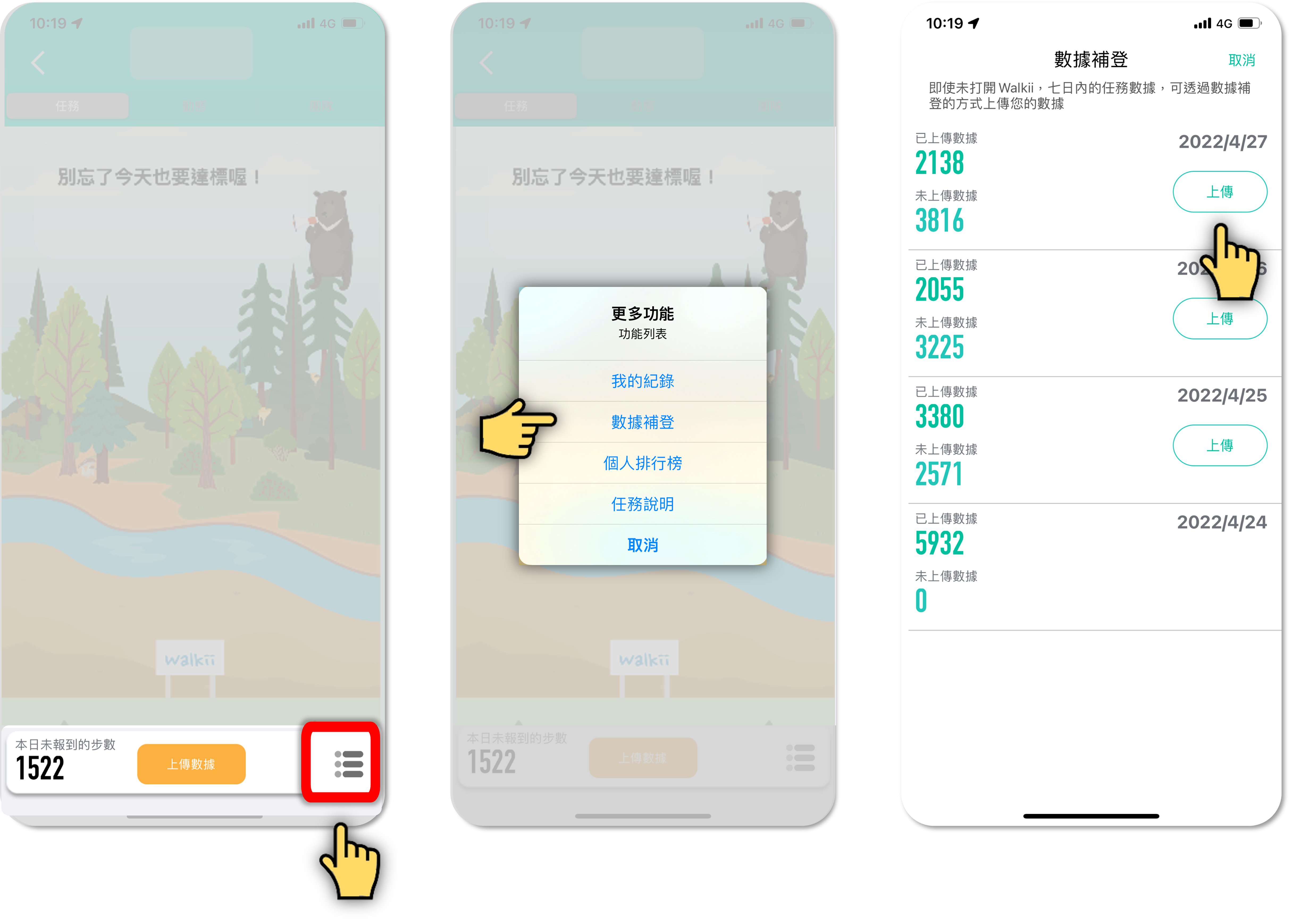 - 點入任務卡畫面右下角圖示,點選『數據補登』上傳七日內的步數數據